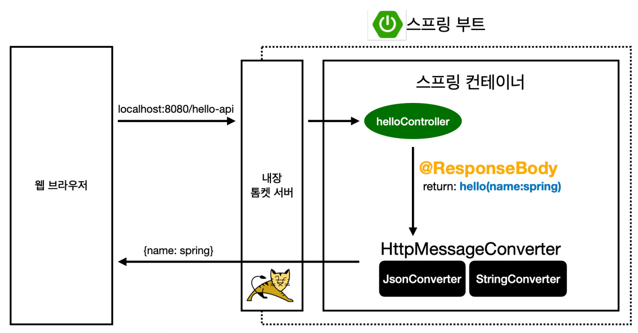 3) 스프링 부트는 먼저 컨트롤러에서 hello-api와 매핑되어 있는 것을 찾아본다. -> 있으면 model에 담긴 변수들과 return 값인 hello을 HttpMessageConverter에게 넘겨준다. (@responseBody 어노테이션이 있으므로 viewResolver 에게 넘기지 않고, HttpMessageConverter에게 넘겨준다.)