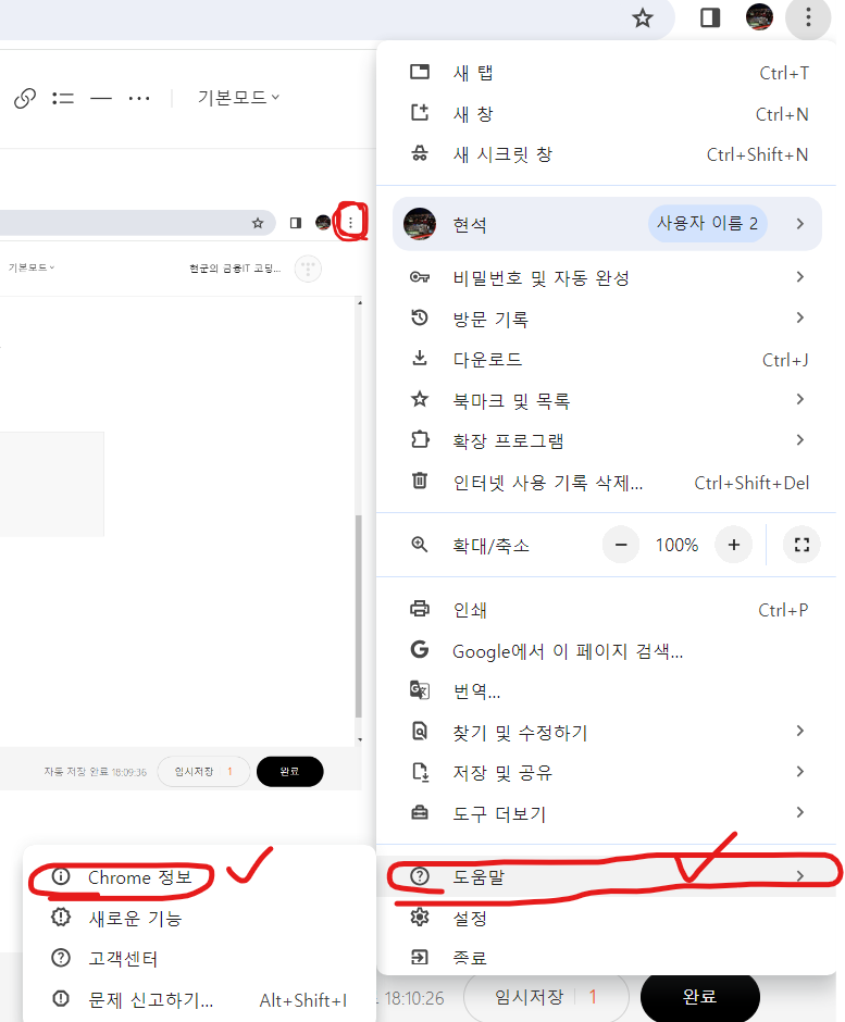 누르고 나면 [도움말] > [Chrome 정보] 을 아래 그림처럼 클릭한다.