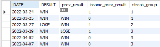 sum(issame_prev_result) OVER (ORDER BY DATE) as 'streak_group'