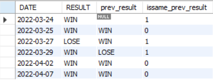 IF(LAG(result, 1) OVER (ORDER BY DATE) = result, 0, 1) as 'issame_prev_result'
